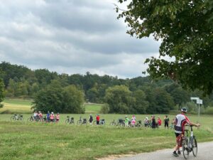 vorbei ging die Fahrt über Westerhausen nach Lauchheim zur Mittagspause. Zurück nur 2 Tröpfchen Regen trotz sehr dunklen Wolken. Nach ca. 65 km erreichten wir unser Hotel.Räder verladen und Rückfahrt. Abschluß der gelungenen Radtour ohne größere Verletzungen und Verluste in den Weiherwiesen.